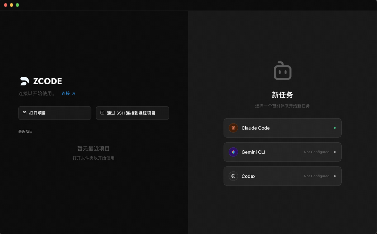 Z Code 采用多智能体框架架构,集成了多款业界领先的命令行 AI 智能体,为用户提供了丰富的 AI 编码能力选择。您可以在应用内直接配置并使用这些强大的智能体服务,无需在不同工具之间切换,实现真正的"一站式"AI 辅助开发。