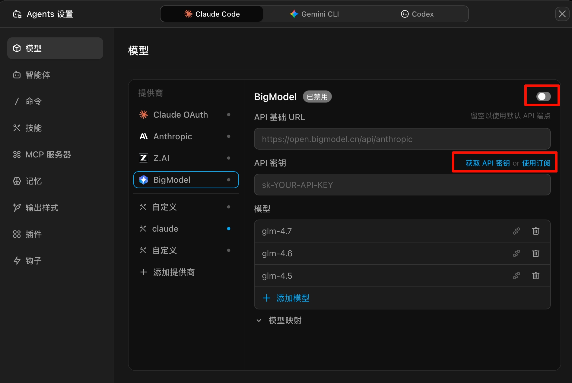 - 填入 API 密钥,即可使用 glm-4.7、glm-4.6、glm-4.5 等内置模型