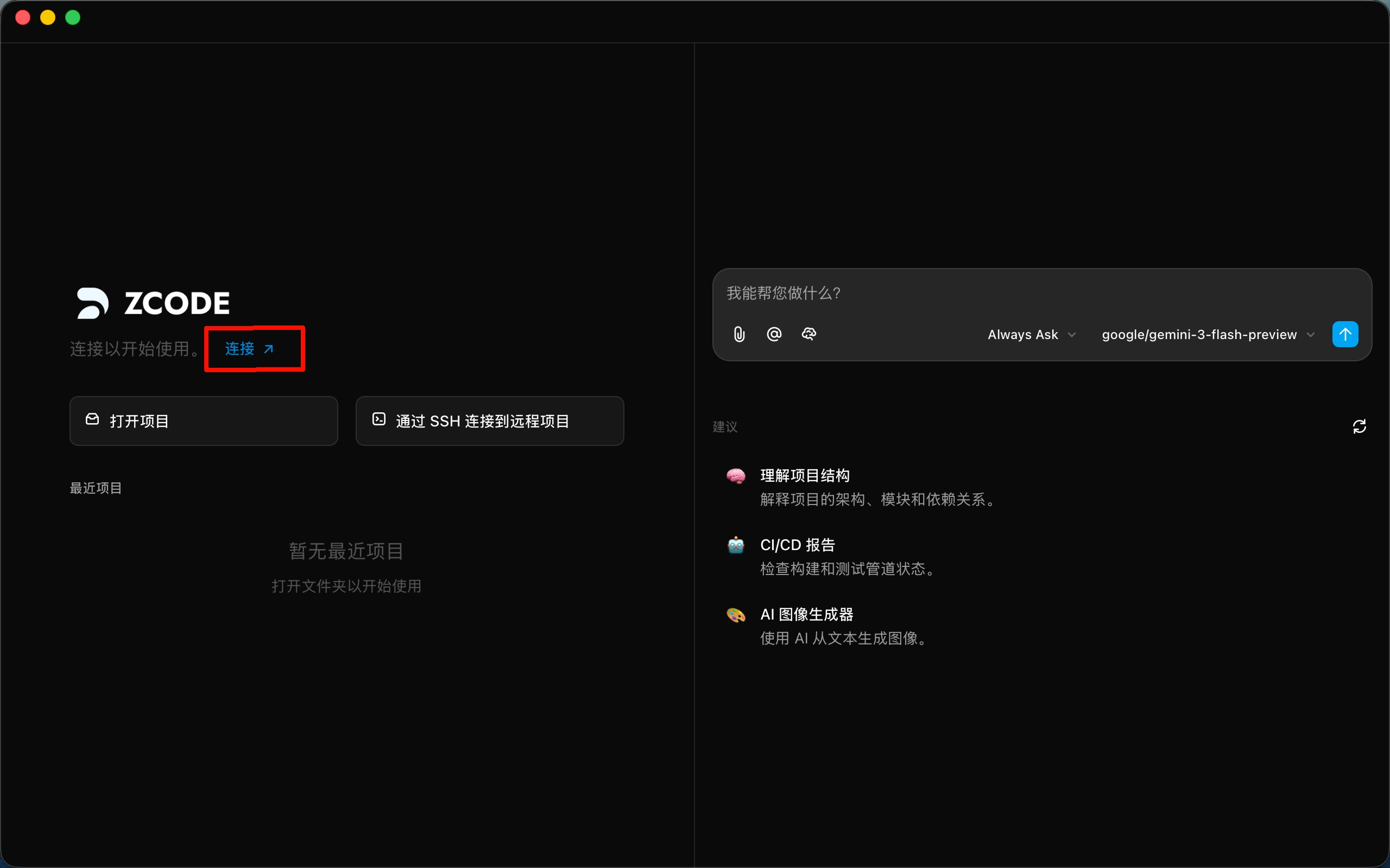 适用于直接连接智谱官方 API 或 GLM Coding Plan 编程套餐。打开 Z Code 桌面应用,在欢迎页面点击「连接」按钮。