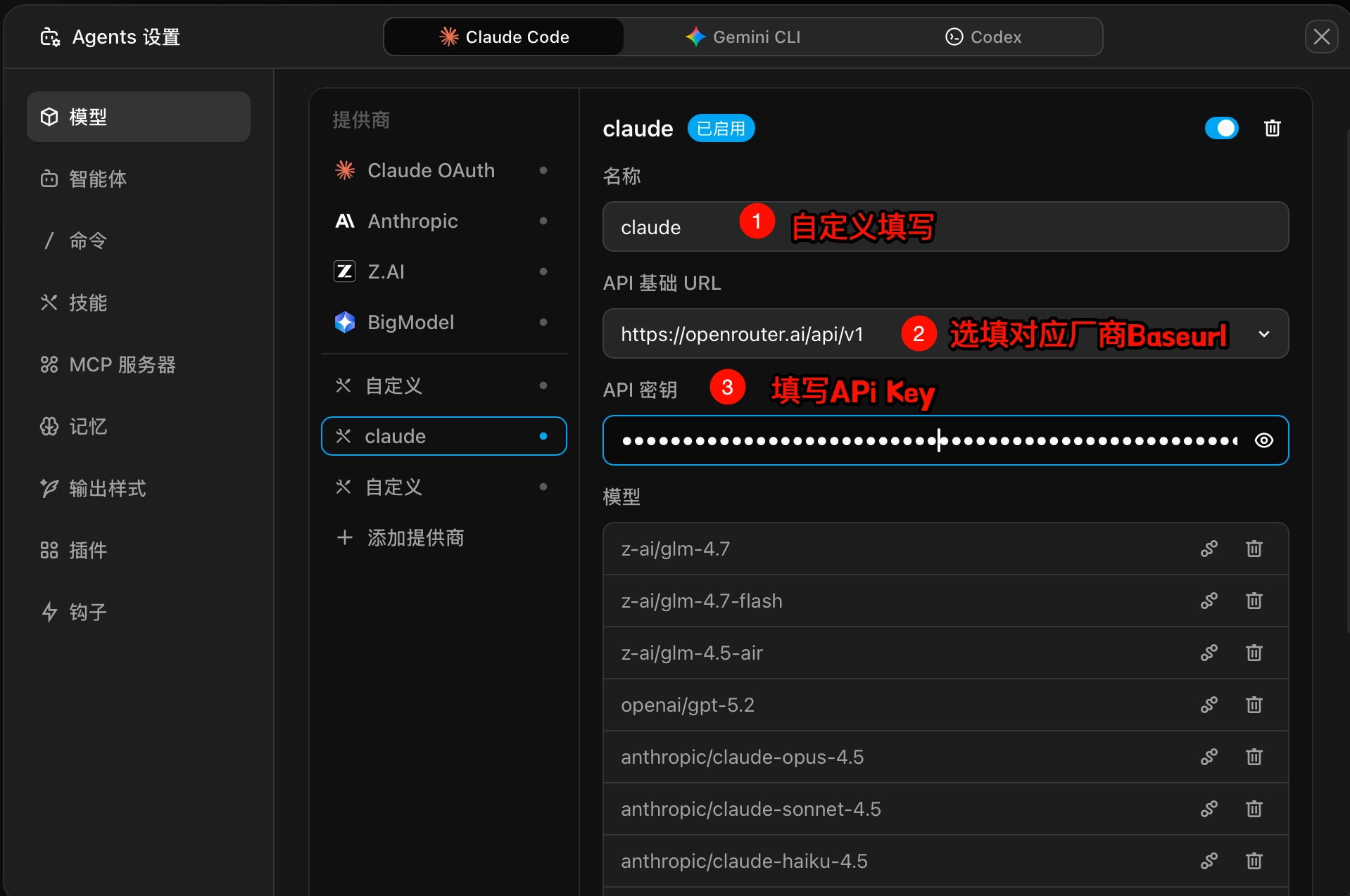 即可进入 Agents 设置/模型 配置面板,在此管理所有 AI 服务提供商。