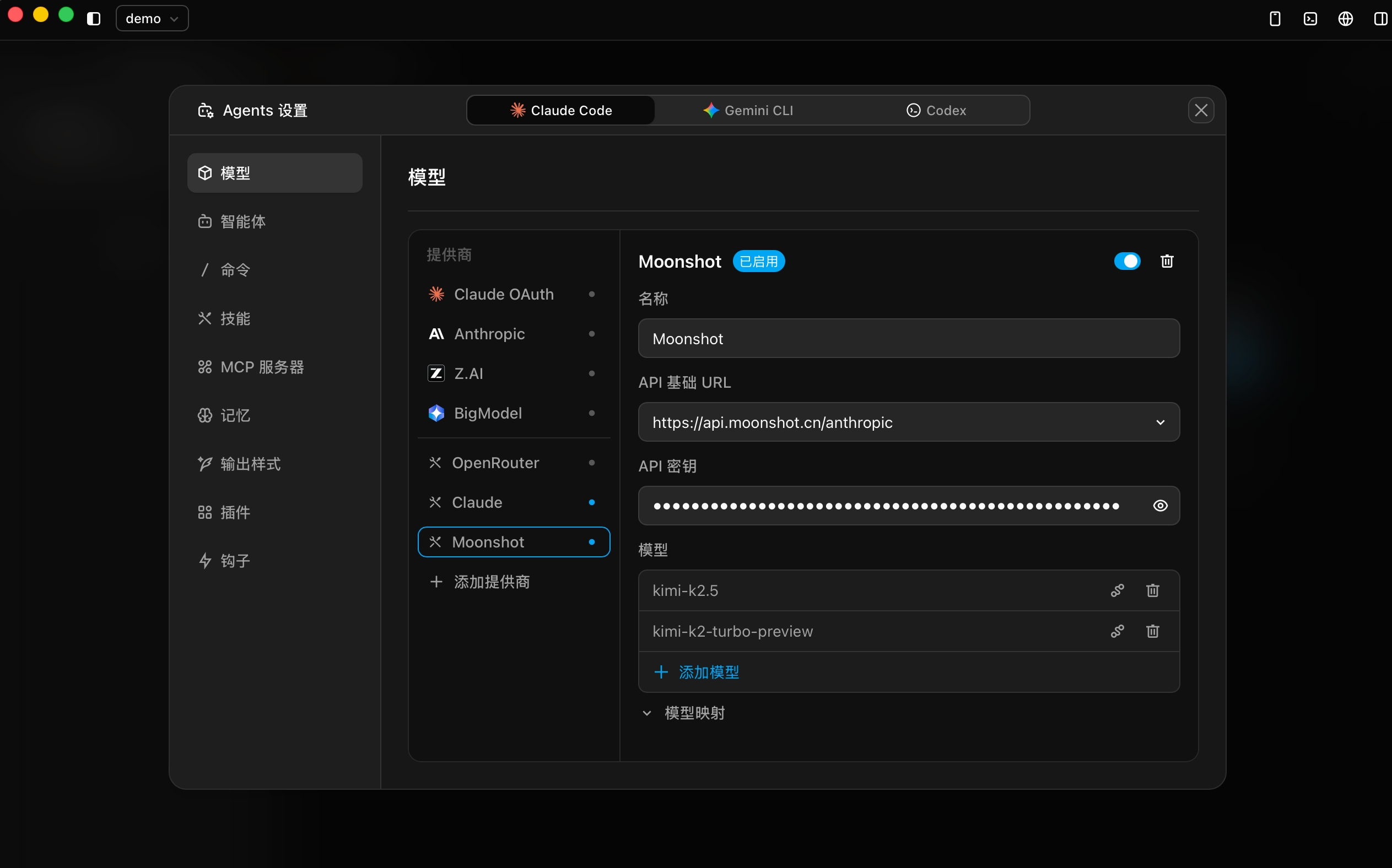 https://api.moonshot.cn/anthropic - 填入 API 密钥,即可使用 kimi-k2.5、kimi-k2-turbo-preview 等模型