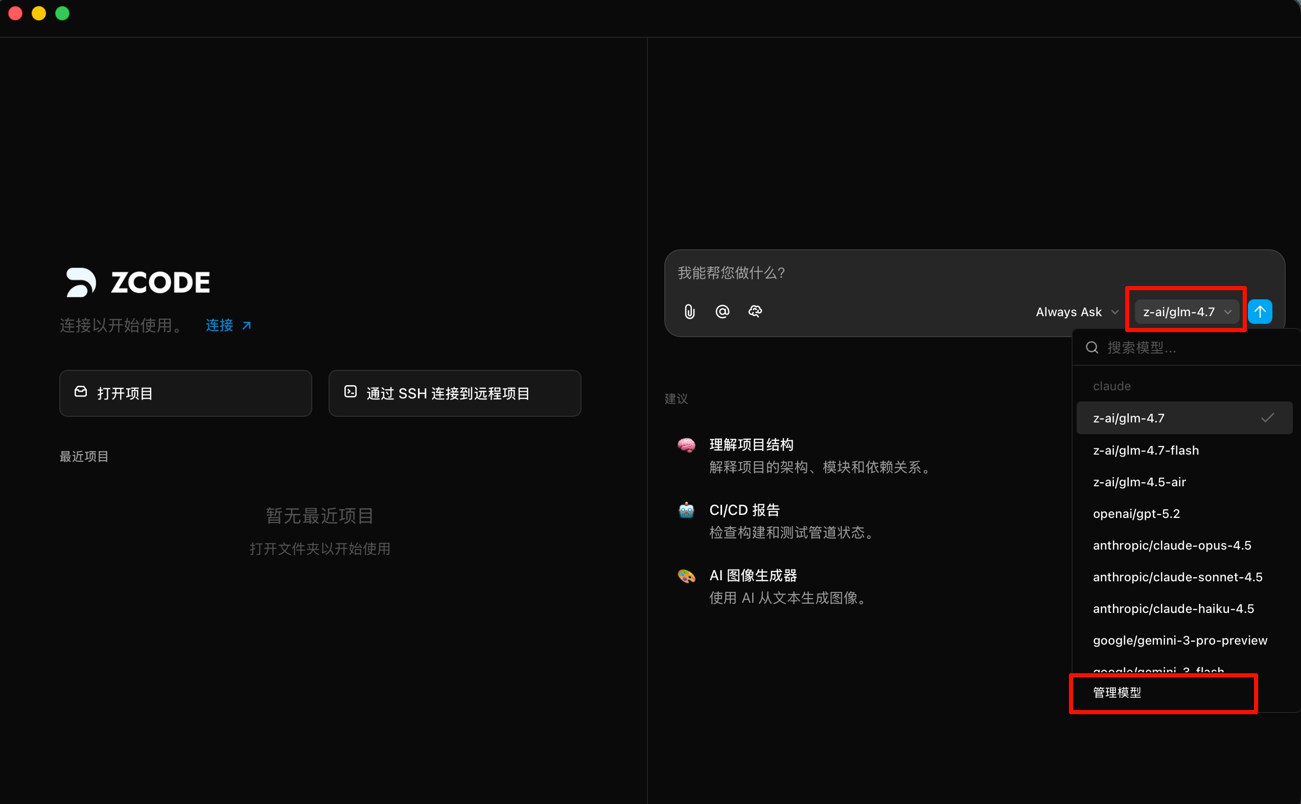 进入 Z Code 后,点击对话框中的模型名称打开模型选择器下拉菜单,在列表底部点击「管理模型」。