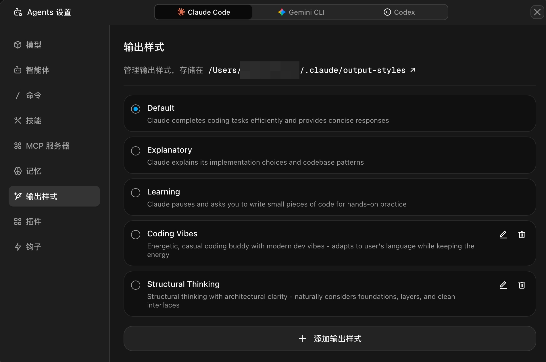 在 Agents 设置 > 输出样式 面板中,你可以查看所有可用风格、切换当前风格、编辑或删除自定义风格。
