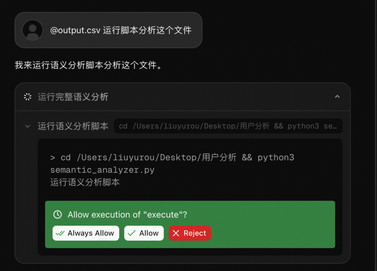 - 触发确认:当 Agent 尝试执行任何具有潜在风险的动作时(例如运行命令行脚本、访问网络资源或修改关键文件),其执行流程会自动暂停。