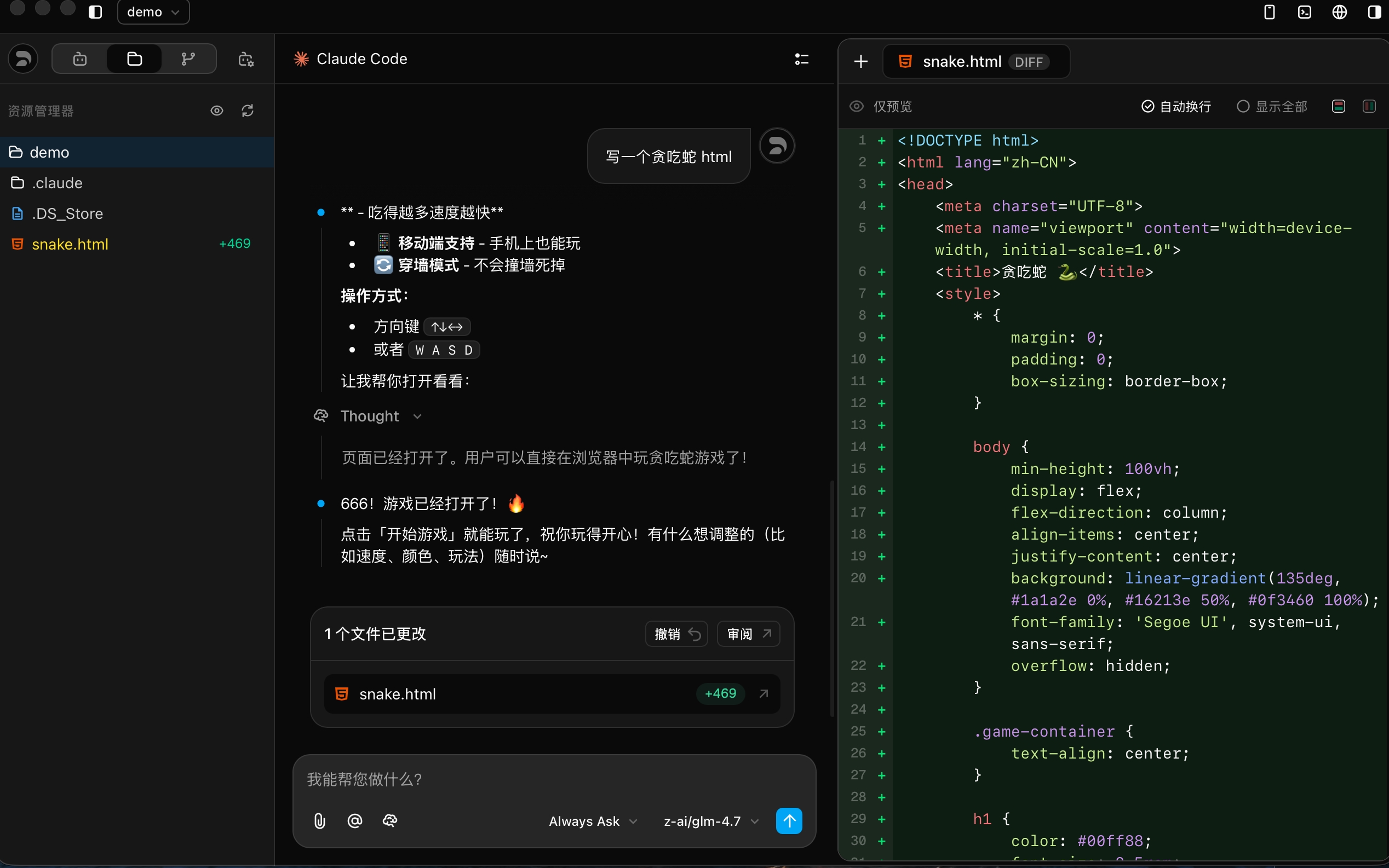 Z Code 会自动追踪所有由 Agent 执行的文件修改,将用户的对话历史作为版本控制时间线。您可以定位到任意一次对话,审查变更或将代码回滚到该对话完成后的版本。