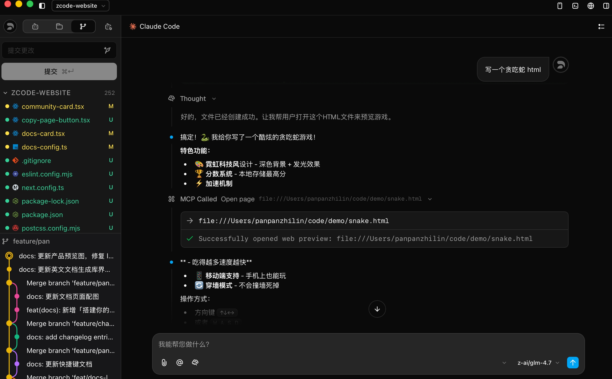 Z Code 内置了完整的 Git 管理面板,您可以直接在界面中完成代码提交,无需切换到终端操作。