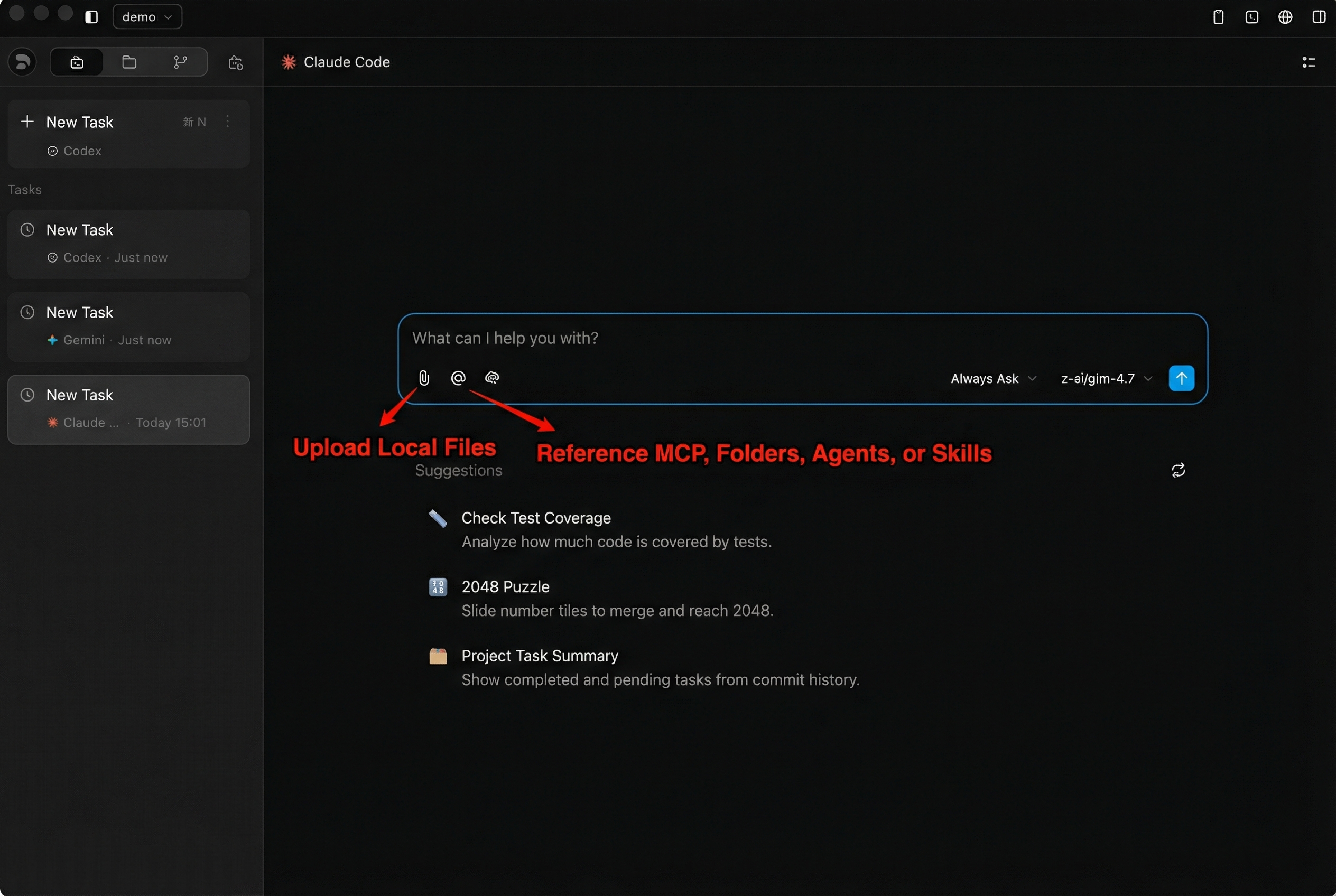 The core interaction feature of Z Code. For every query, you can fine-tune configurations including AI model selection, permissions, file context uploads, and enabling Thinking Mode. This mechanism is designed to give you full control over every specific action the Agent takes, adapting to the complex needs of different tasks.