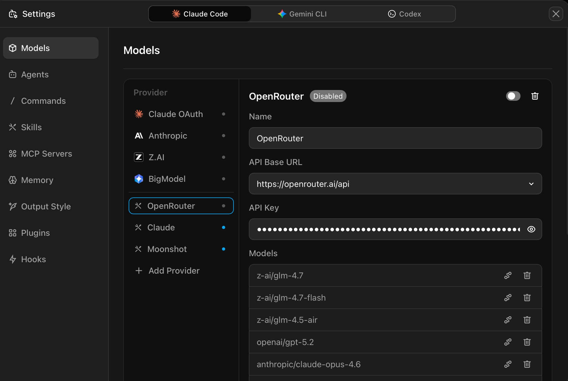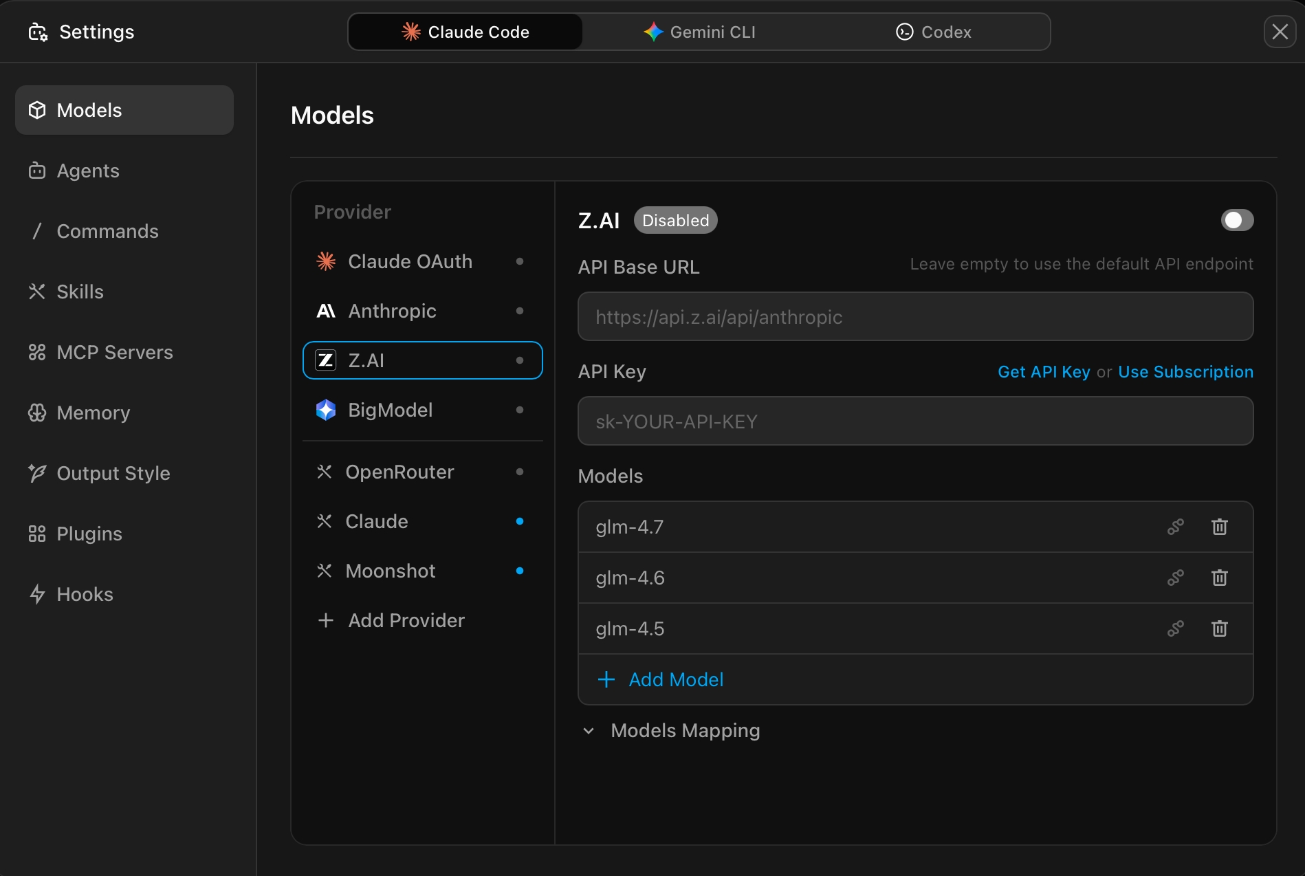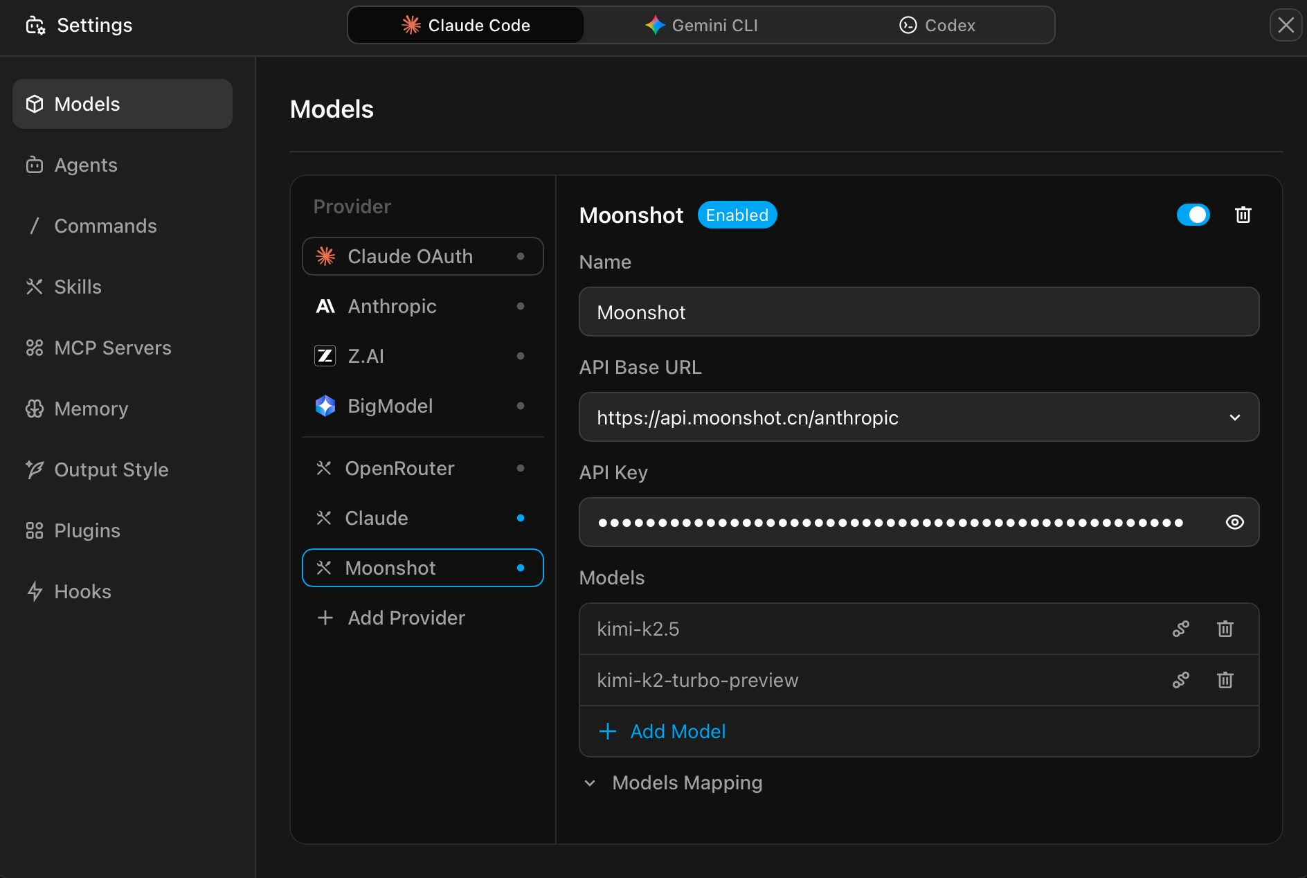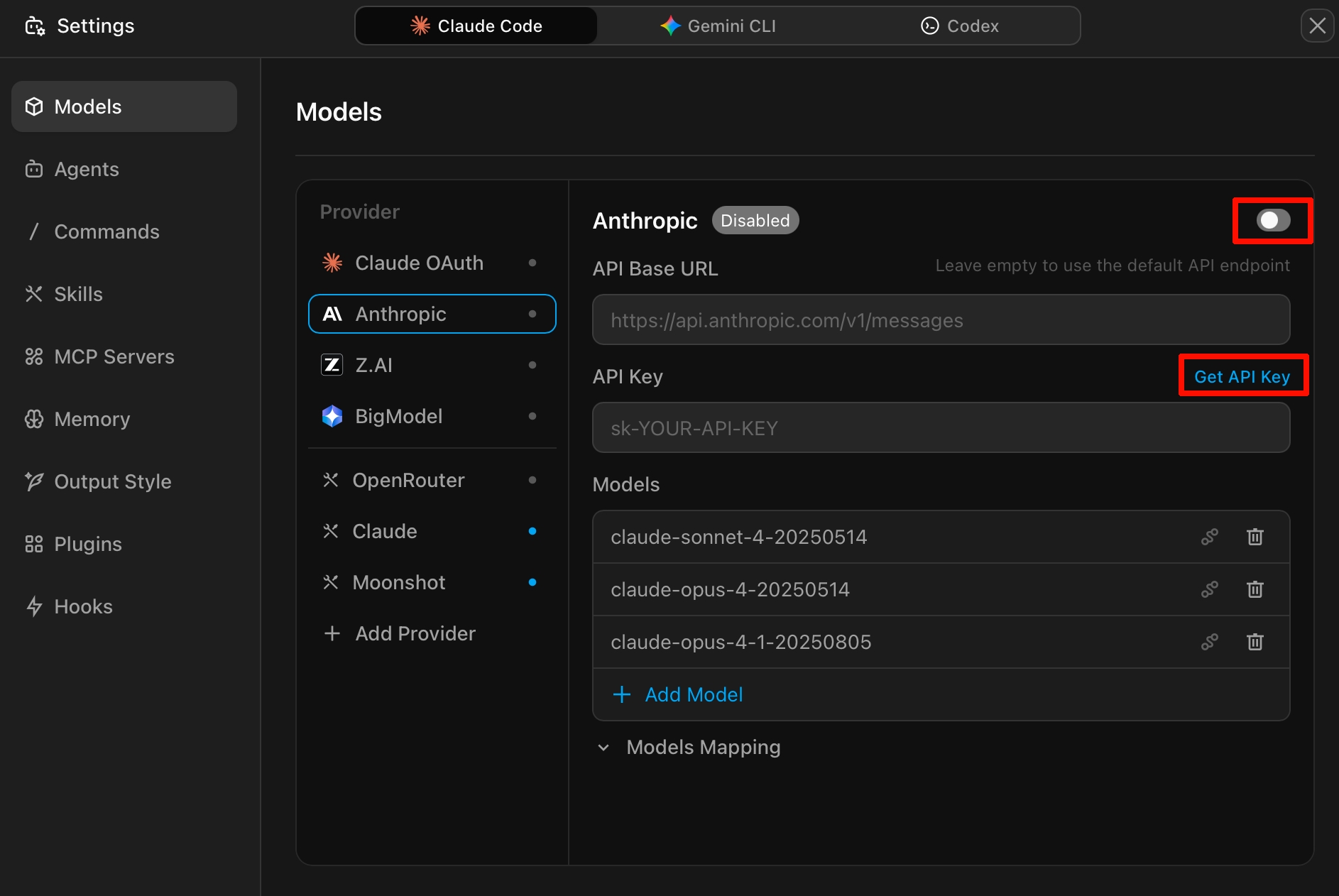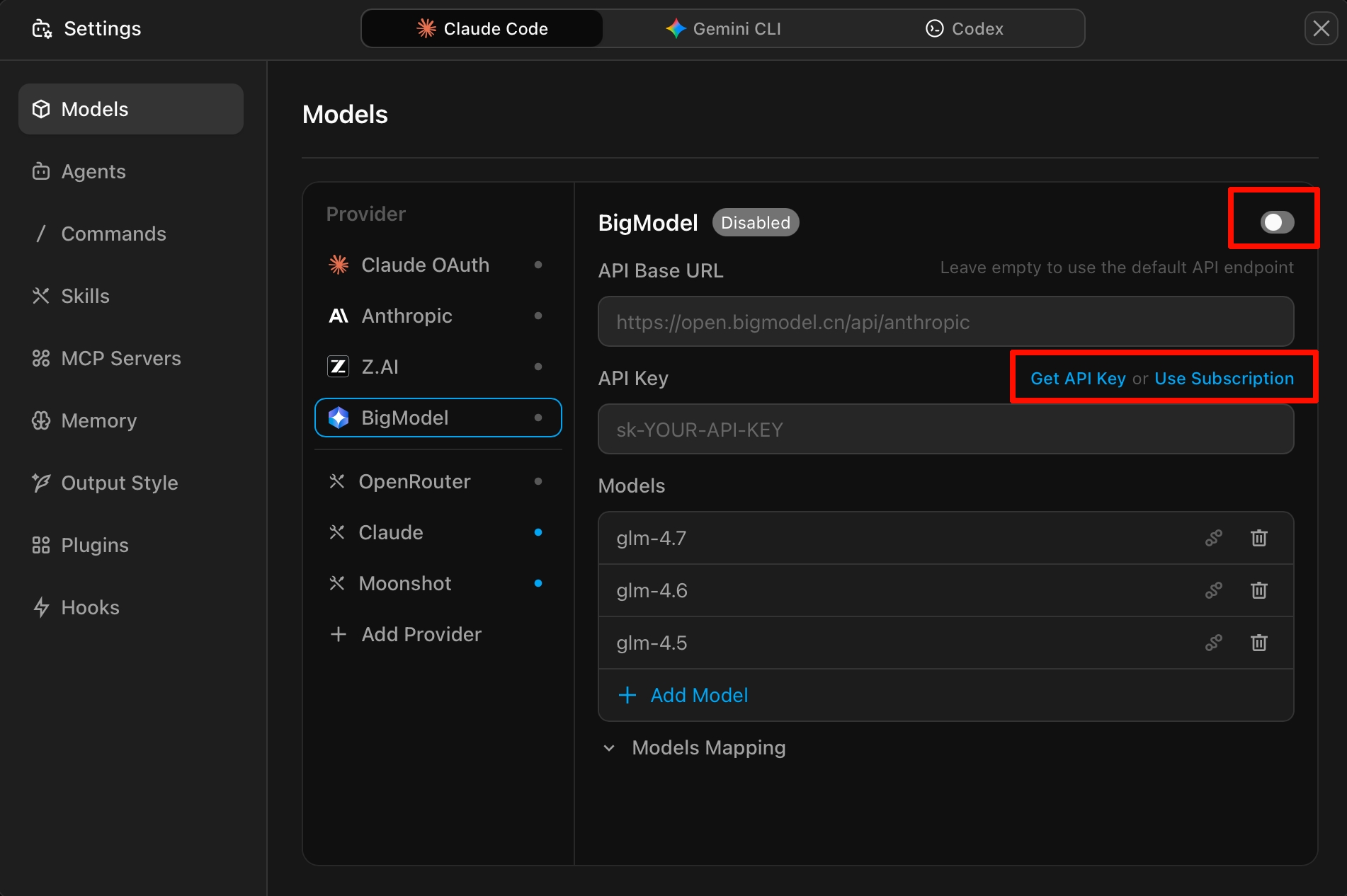- Enable the toggle switch, then add the models you want to use via "Add Model"