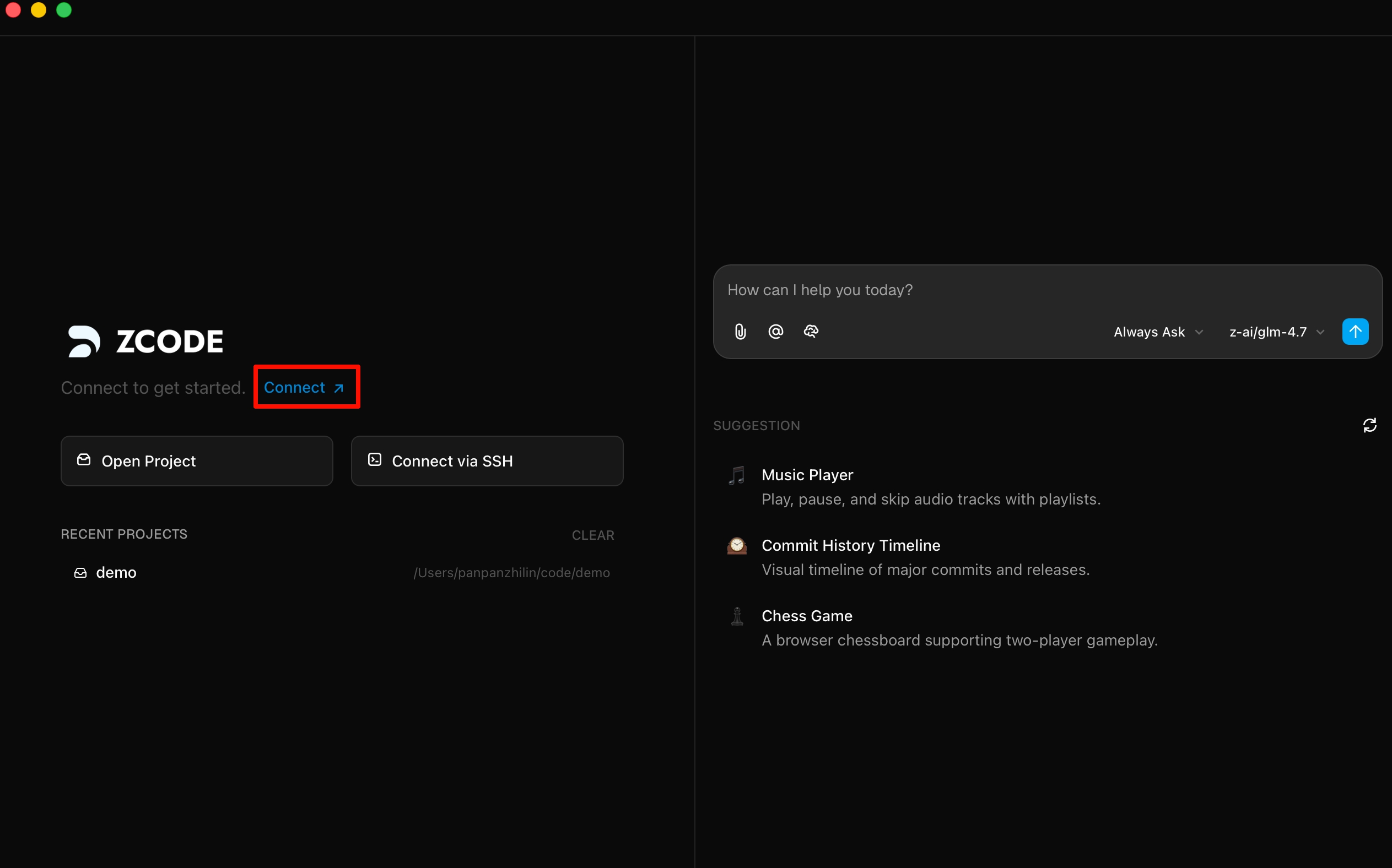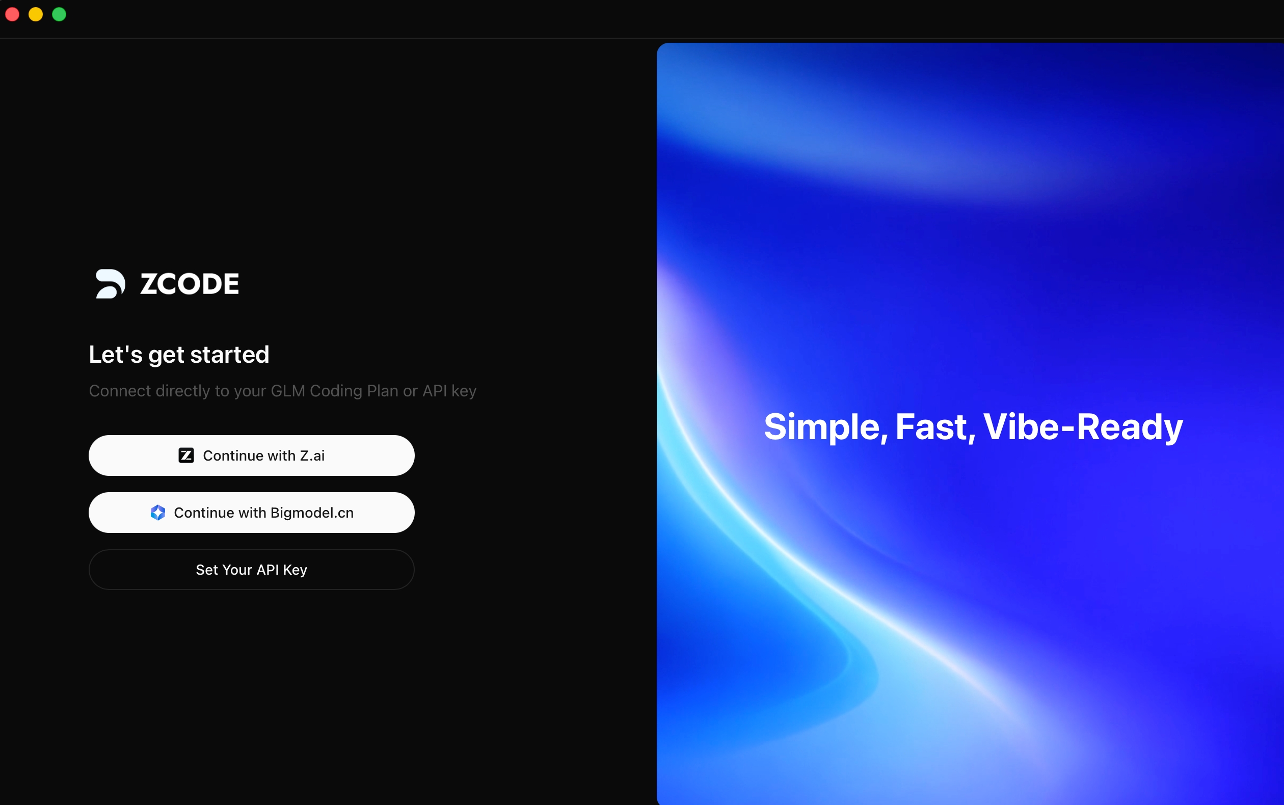 Suitable for directly connecting to the official Zhipu API or GLM Coding Plan. Open the Z Code desktop app and click the "Connect" button on the welcome page.
