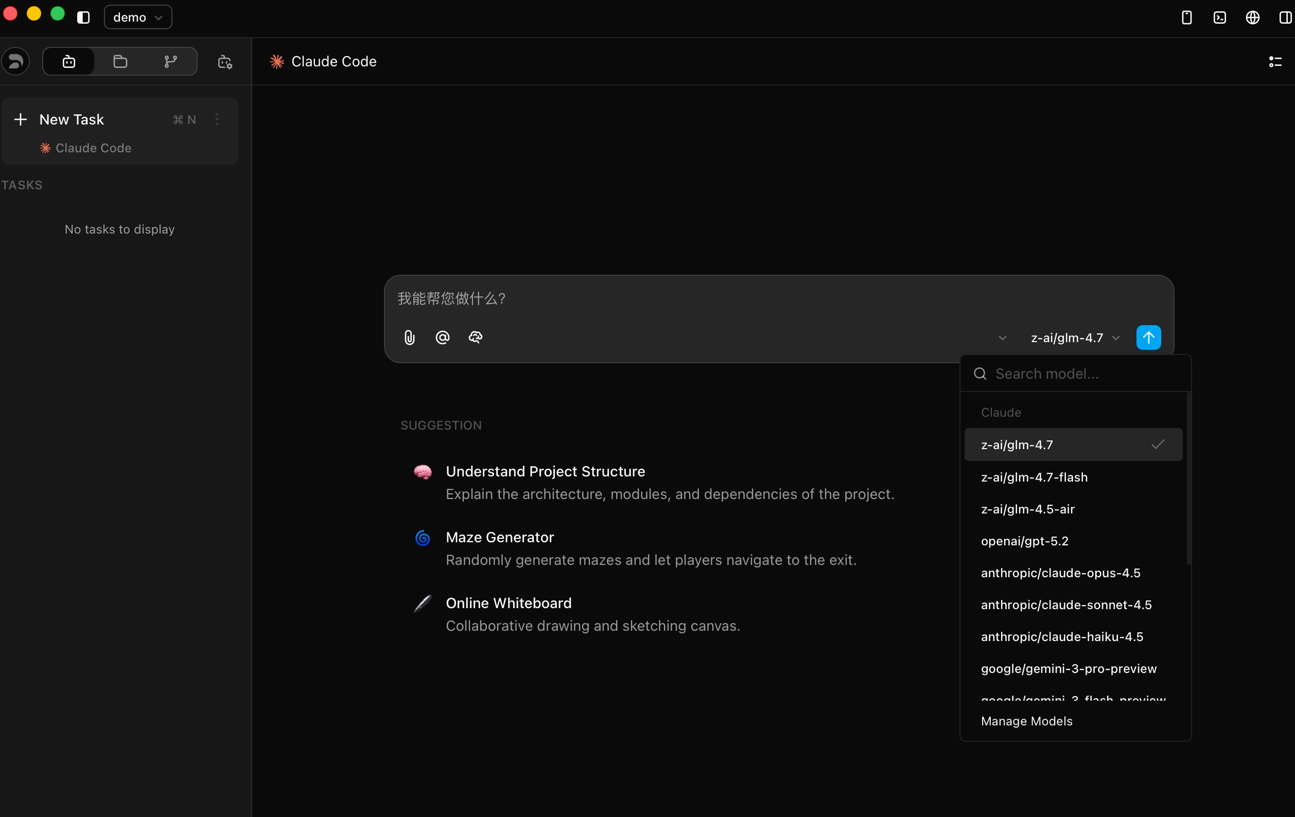 Once inside Z Code, click the model name in the chat box to open the model selector dropdown, then click "Manage Models" at the bottom of the list.