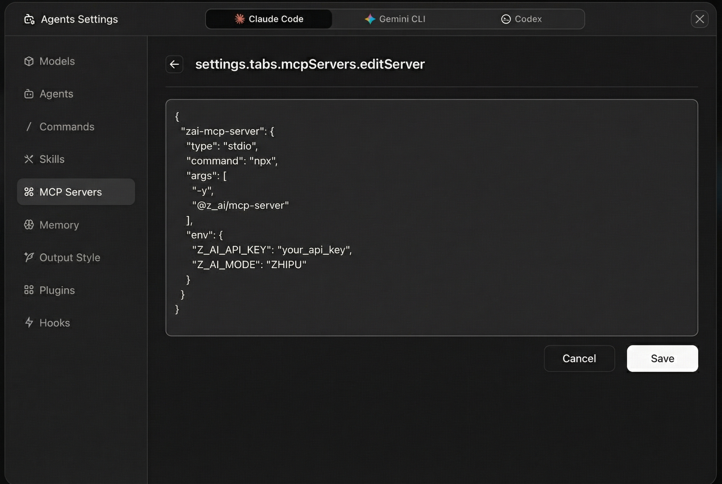 - In Z Code Settings -> MCP Servers, find and edit