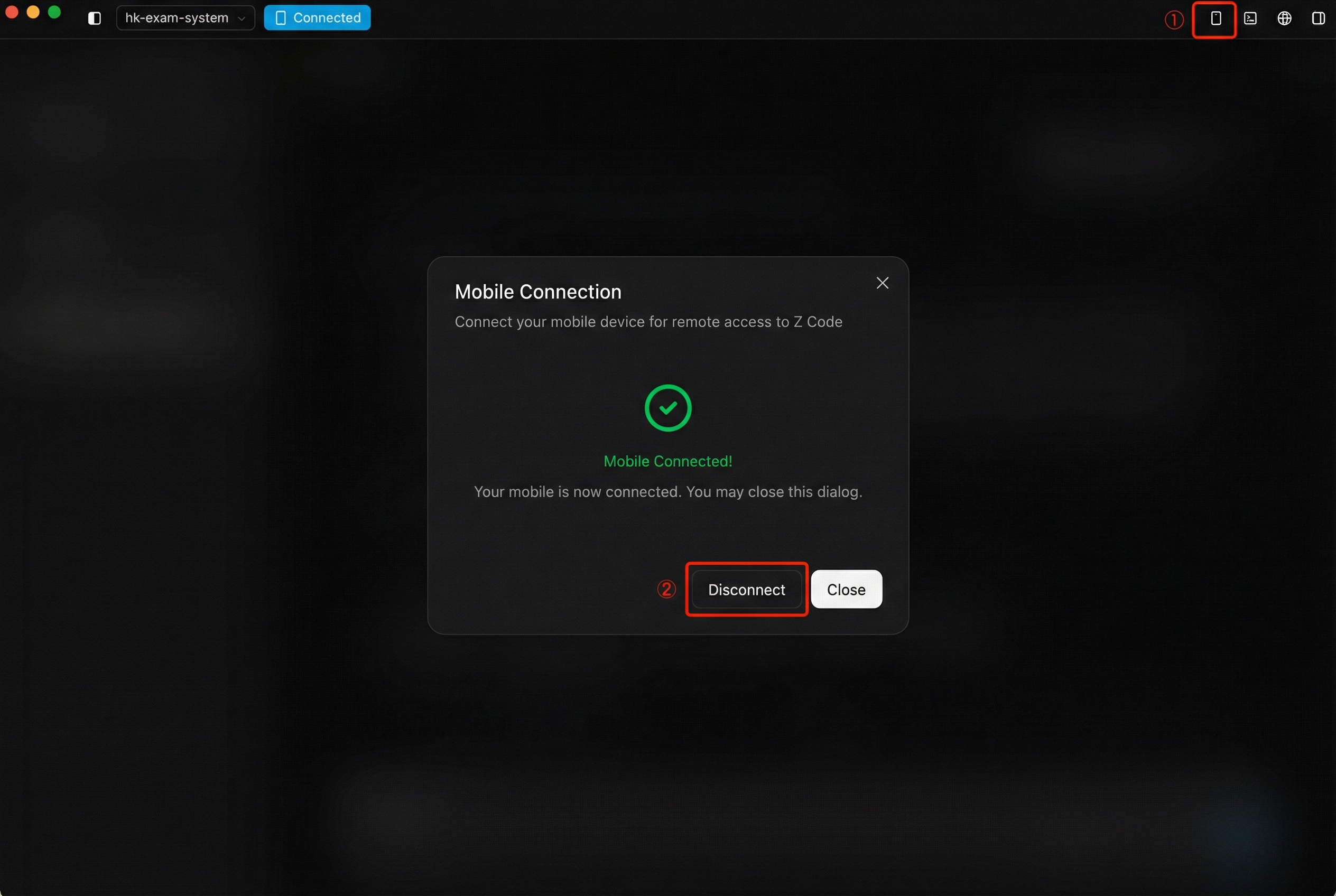 Once connected, you can see a real-time view of your desktop session on your mobile device and interact with Z Code via text input. All code operations still execute on the desktop — the mobile device only handles display and input, ensuring a consistent development environment.