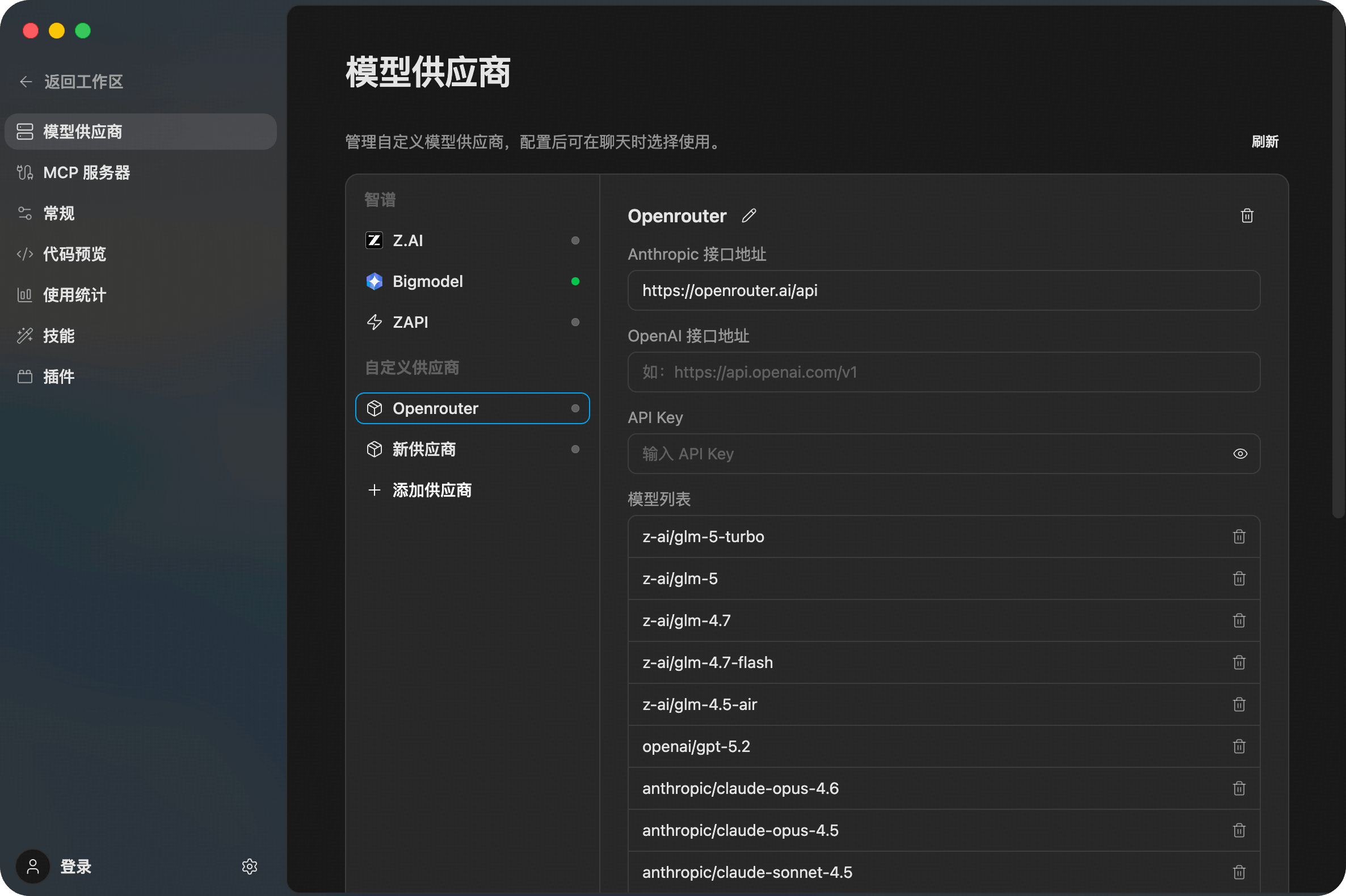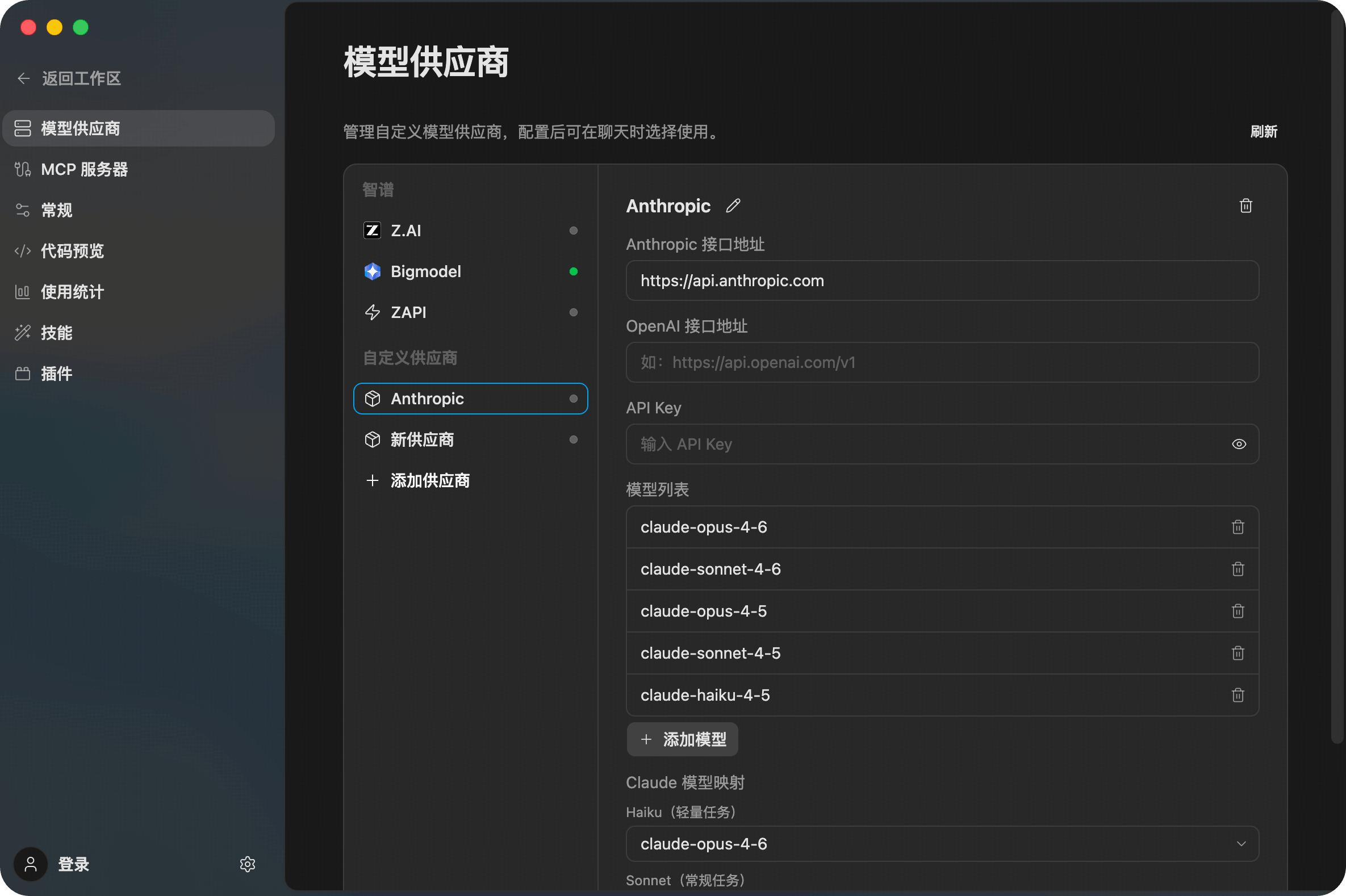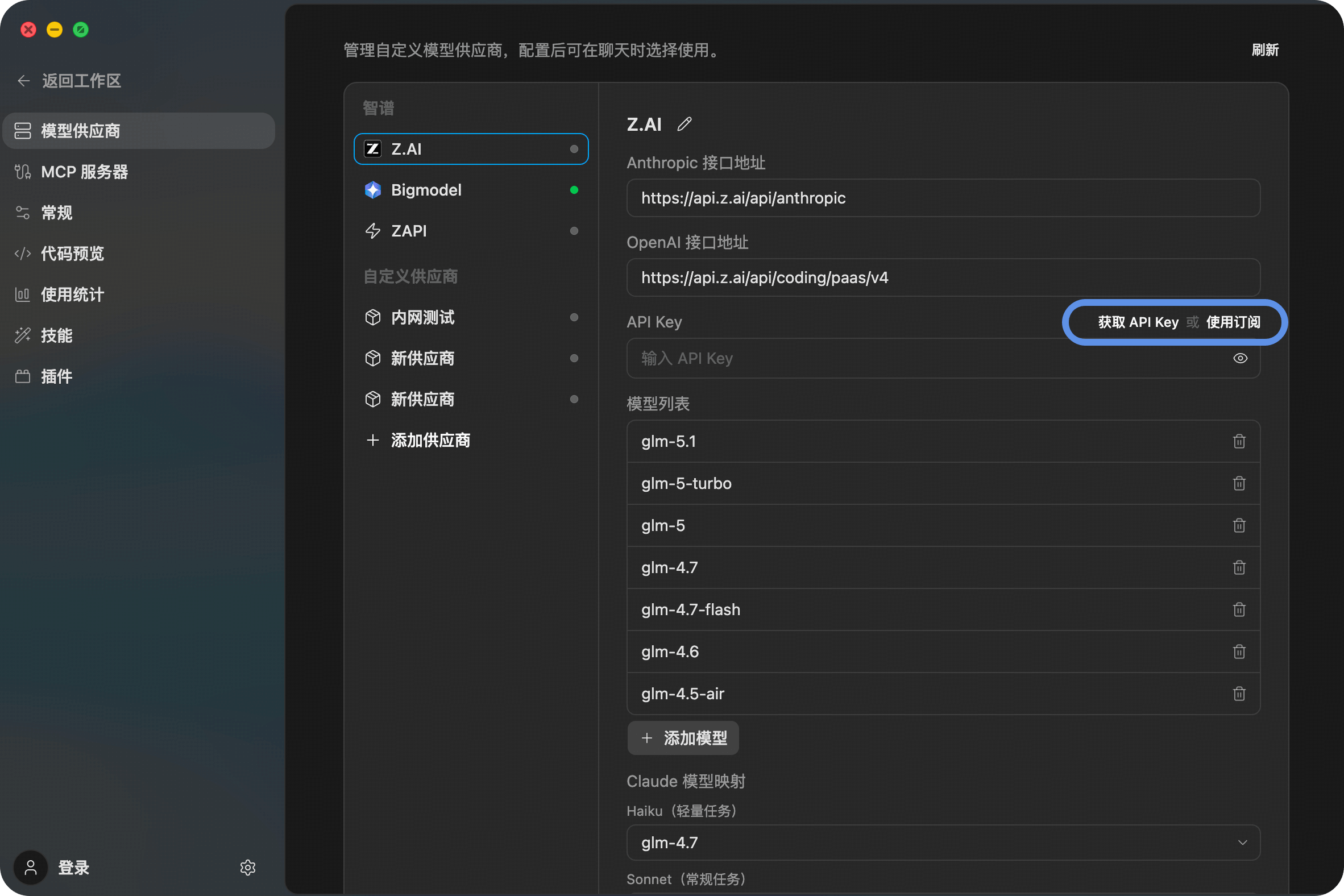 Z Code supports adding any AI service compatible with the Anthropic / OpenAI protocol as a custom provider.