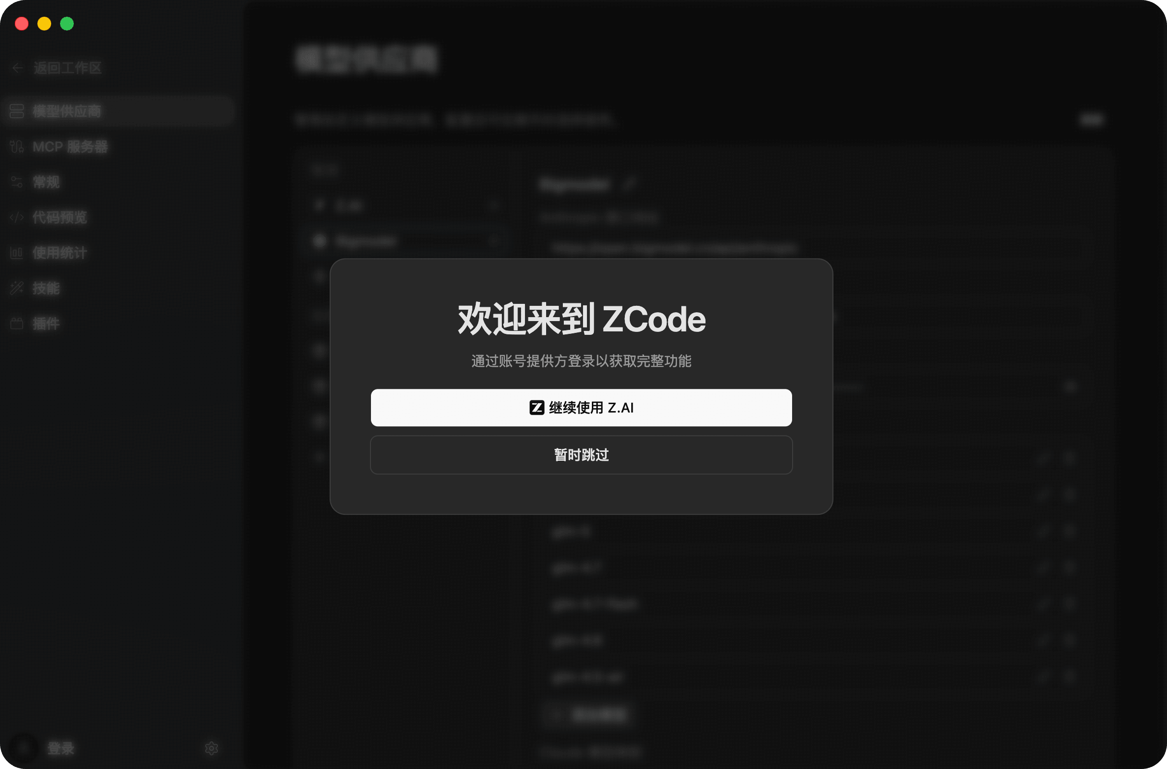 Click Continue with Z.AI to sign in and enter the workspace. If you do not want to sign in yet, you can also click Skip for now and configure API keys later from the model provider page.