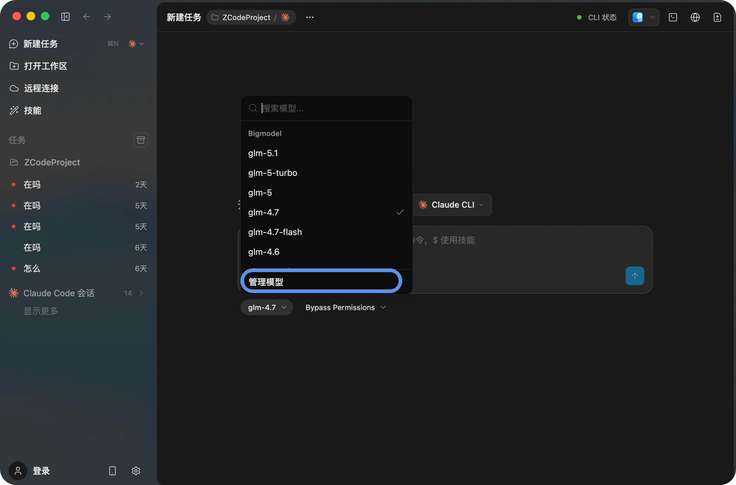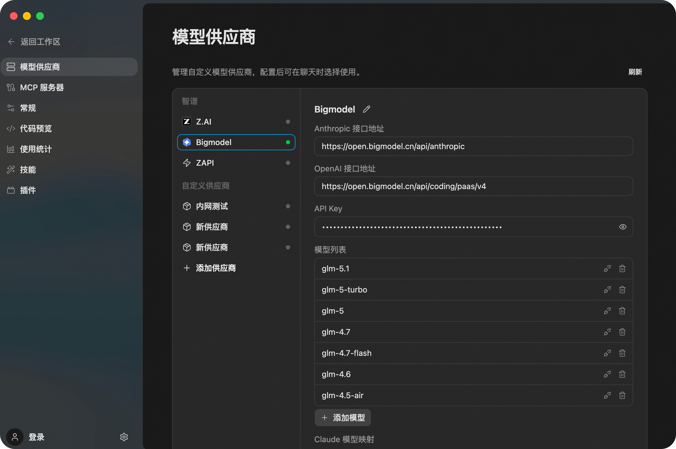 - Select BigModel from the provider list on the left