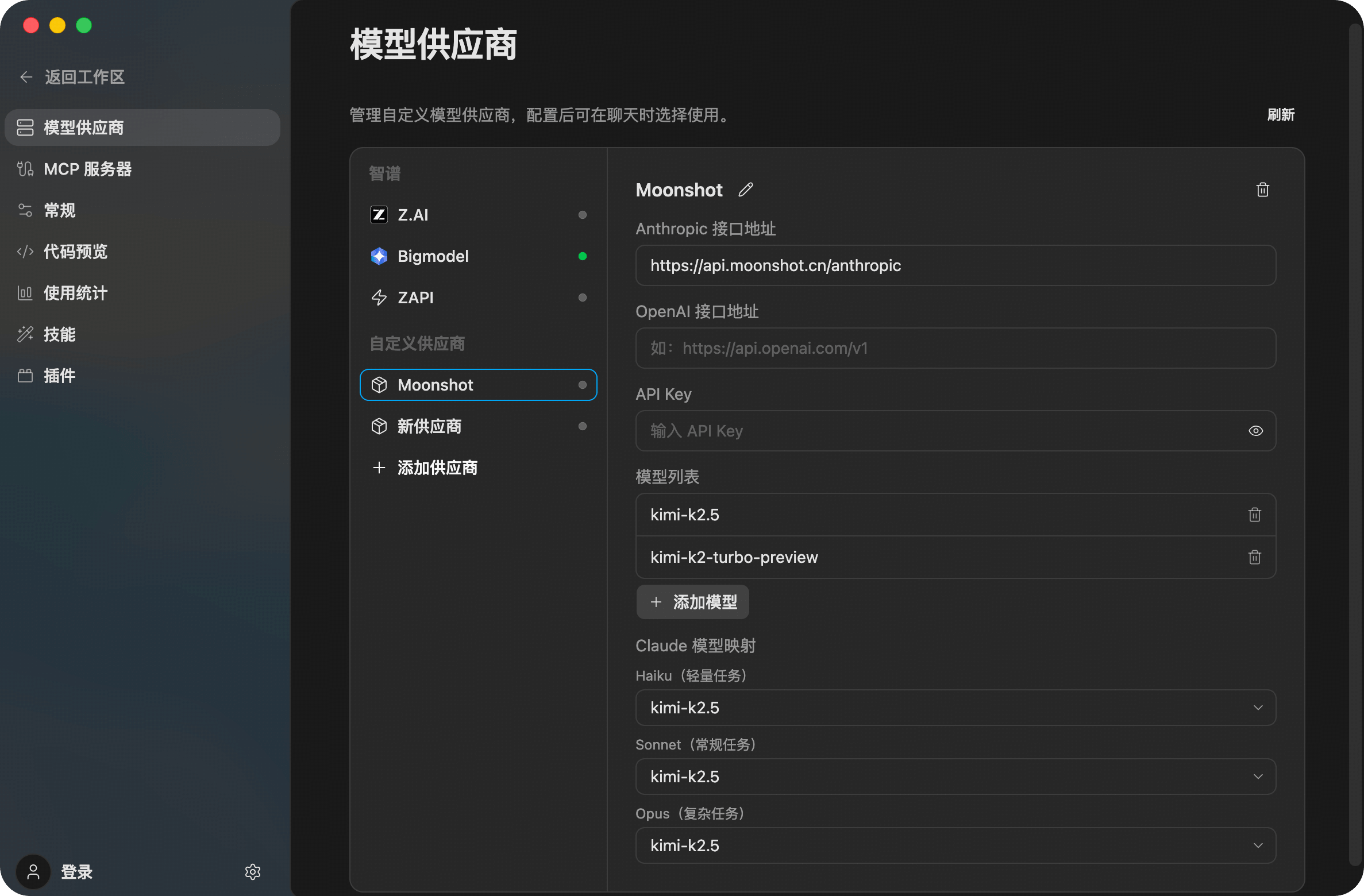 https://api.moonshot.cn/anthropic - Fill in the API key to use models such as
