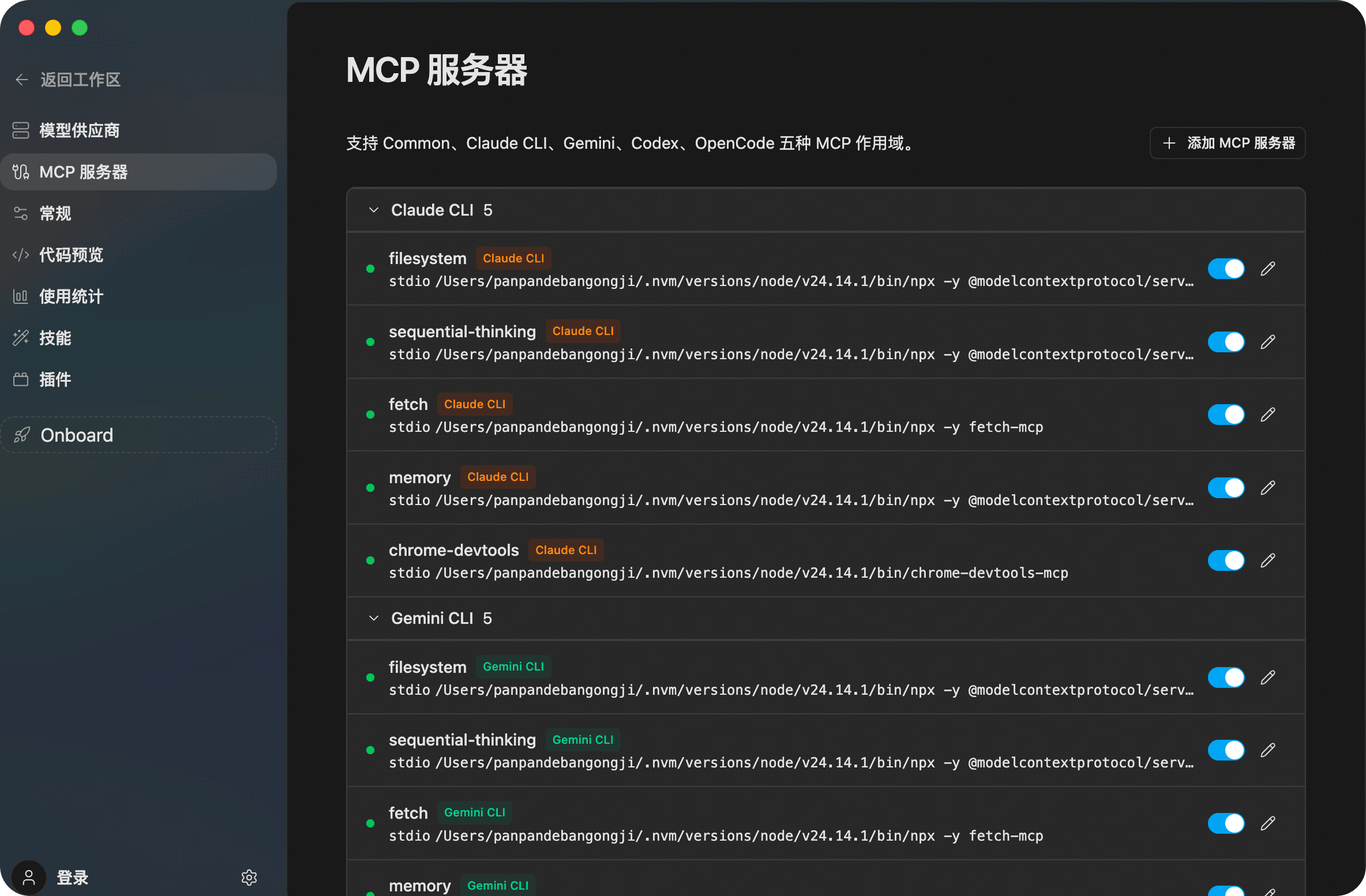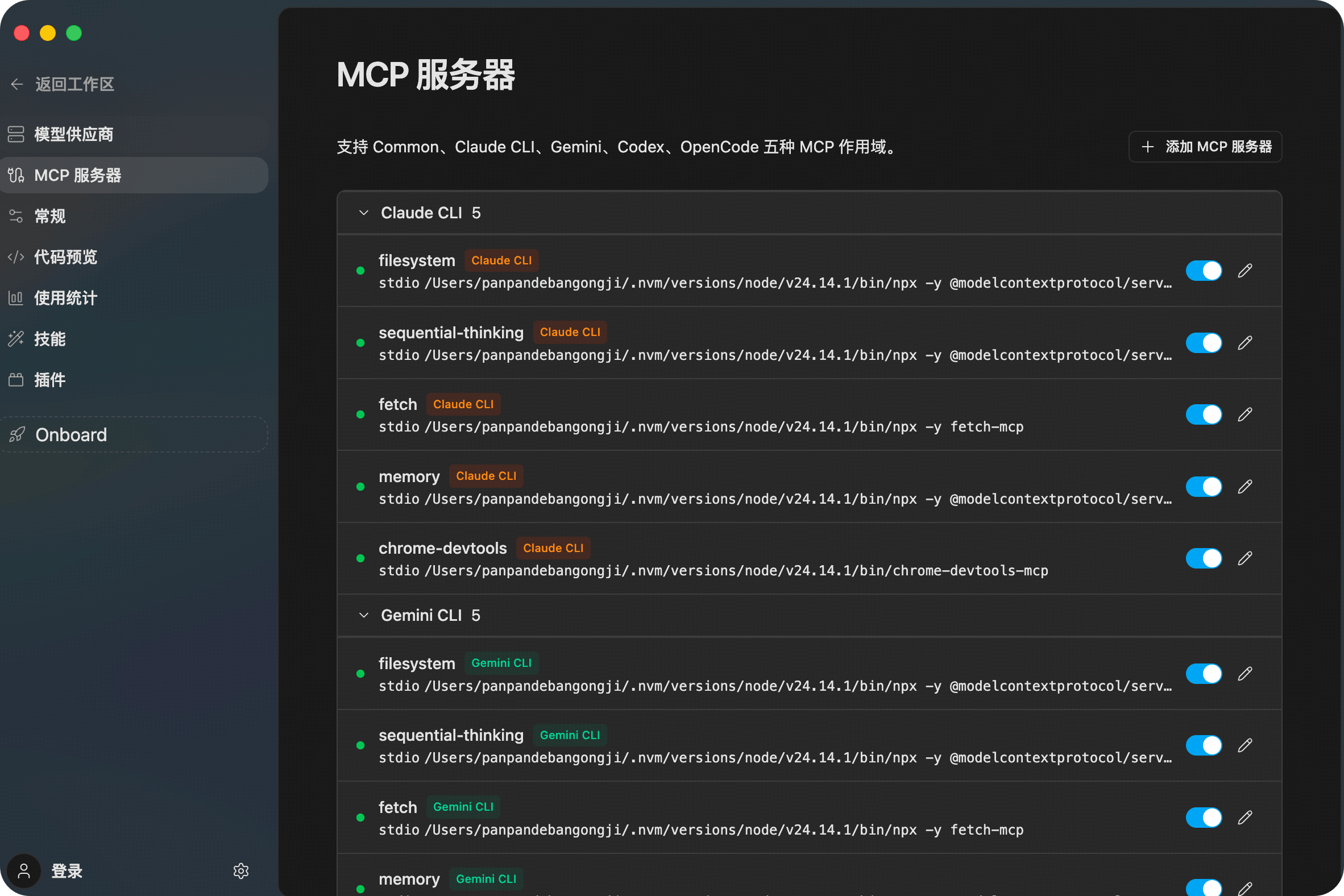 The current UI groups services by scope, such as Common, Claude CLI, Gemini, Codex, and OpenCode. Each service shows its name and command details, and can be enabled or disabled with the toggle on the right.