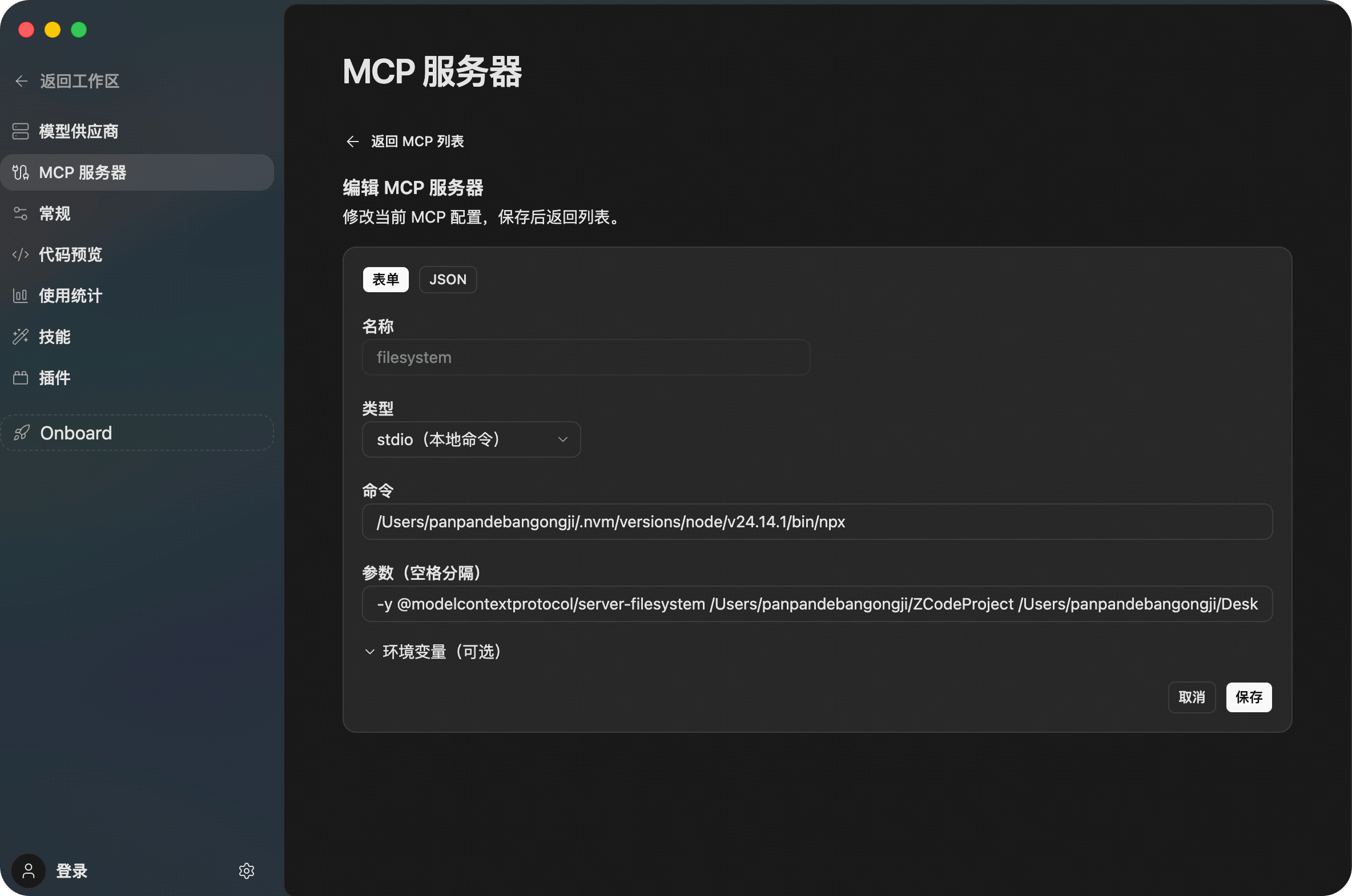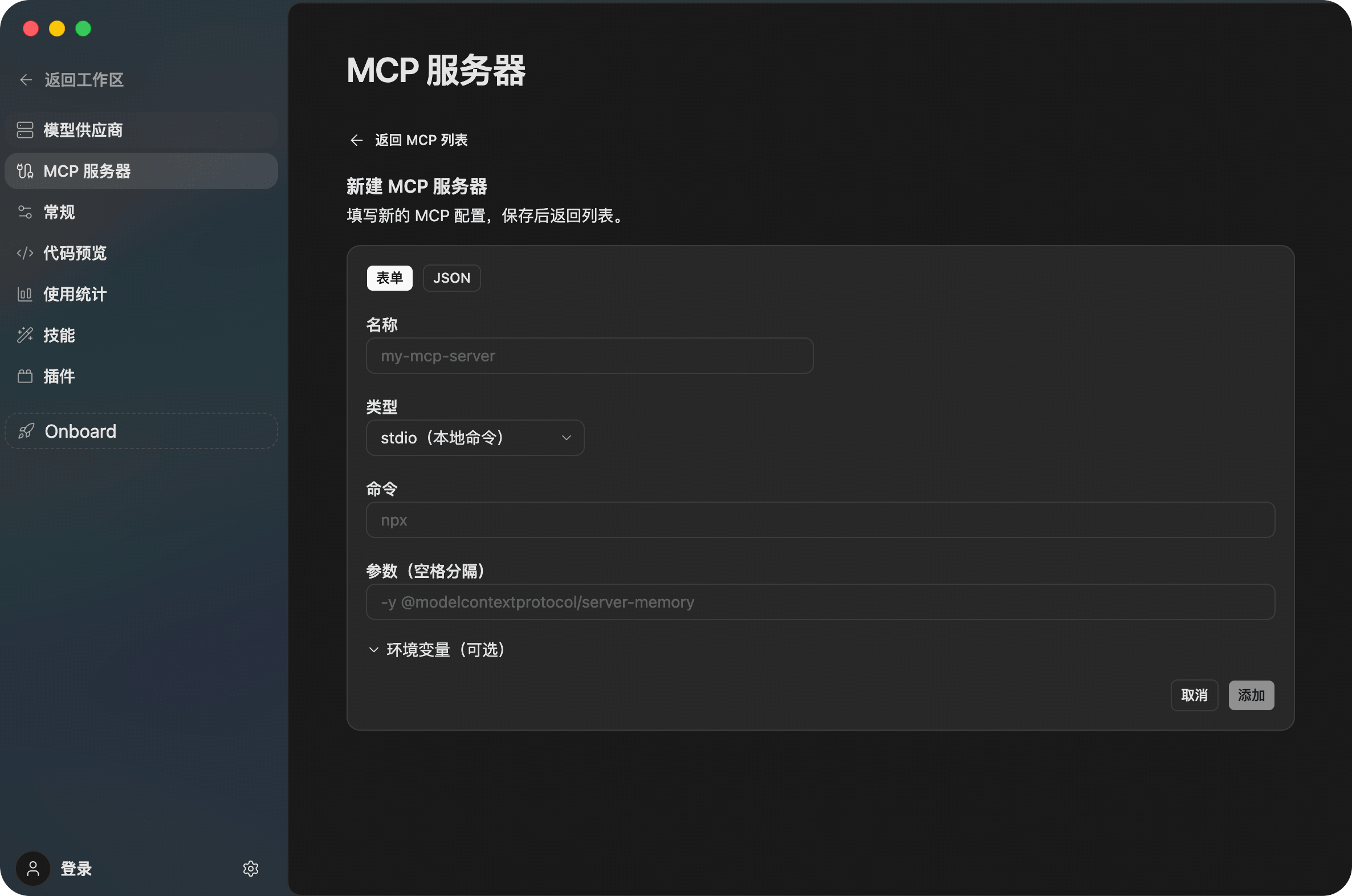 Click Add MCP Server in the upper-right corner to open the creation form. You can fill in the name, type, command, arguments, and environment variables, and switch between Form and JSON modes.