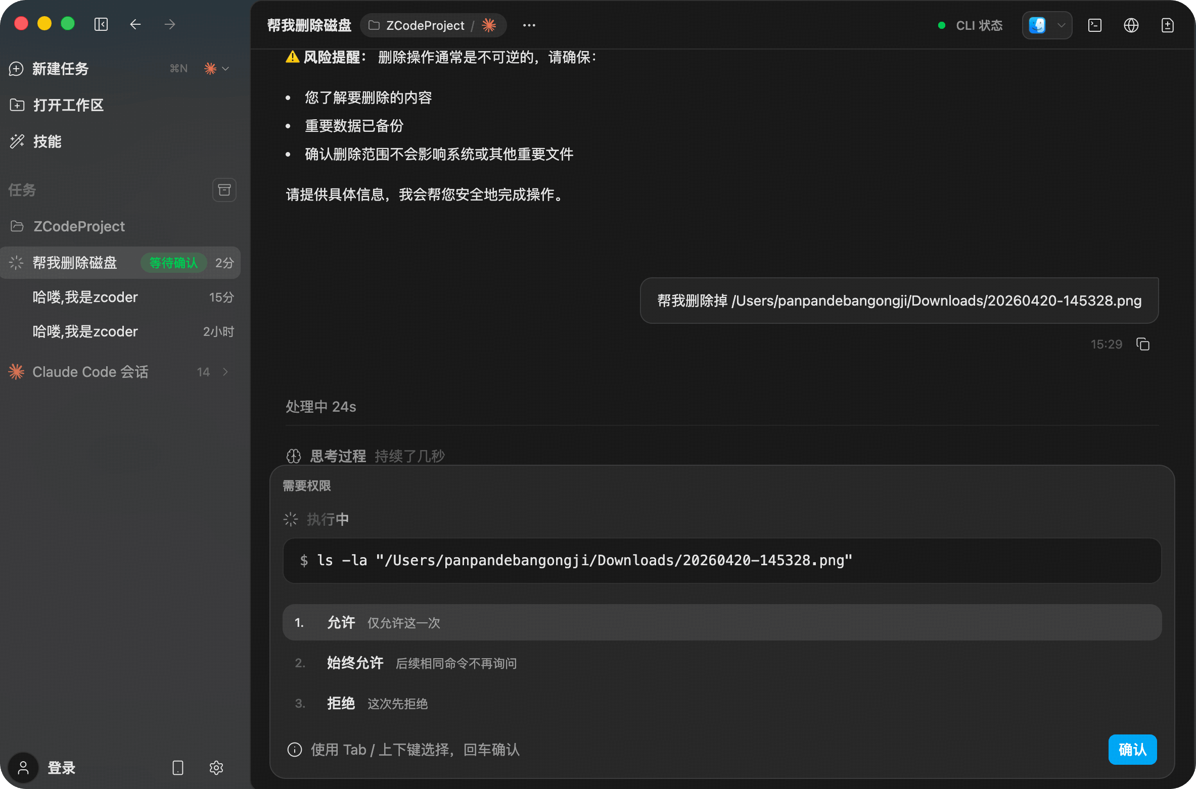 To ensure that any Agent action with potential impact on your local system remains fully under user control, Z Code enables a manual confirmation step before execution by default.
